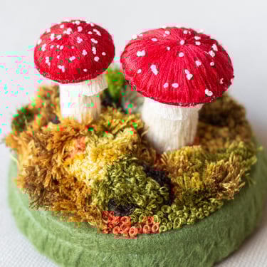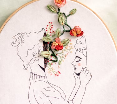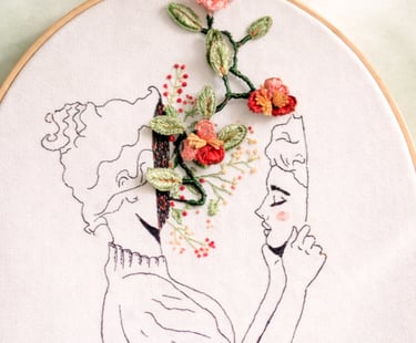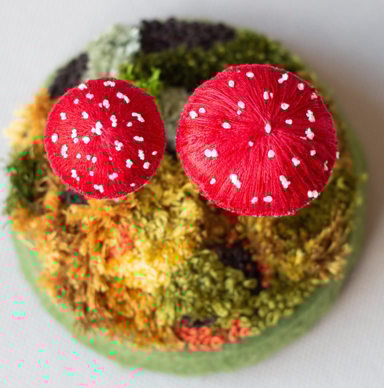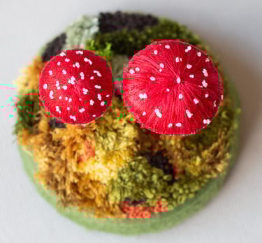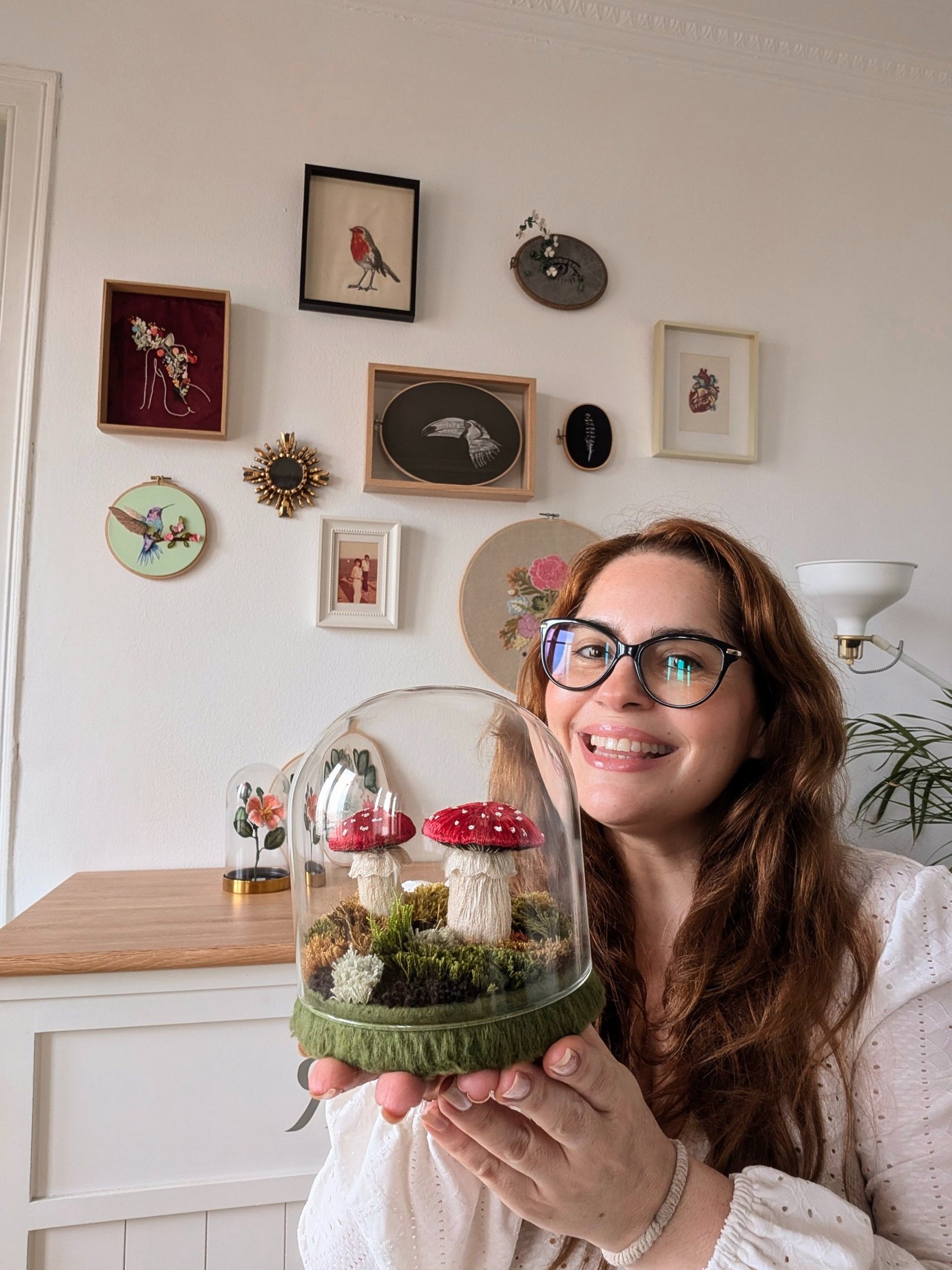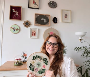 Descubre mi colección de arte textil contemporáneo, con obras de bordado artístico, bordado tridimensional (stumpwork), esculturas en hilo y accesorios bordados, todas hechas a mano con paciencia, cuidado y técnica. Cada pieza está diseñada para ocupar el espacio con delicadeza y presencia, reflejando la atención y el mimo de cada puntada.
